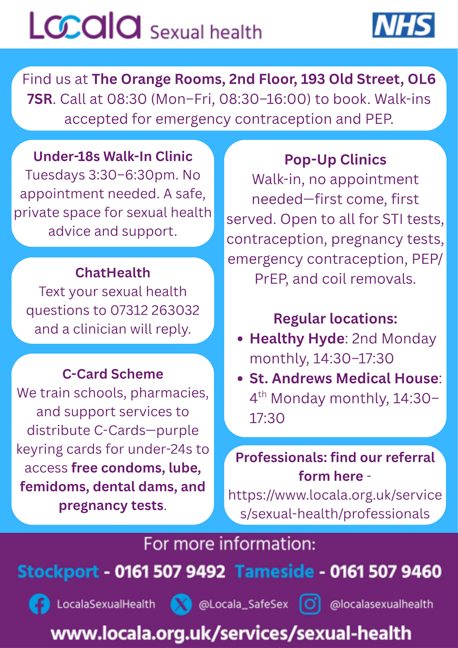 Locala is a Health & Wellbeing's Sexual Health Outreach Team based in Tameside and in Tameside. They can offer you help and support with sexual health services such as STI testing and preventions as well as access to contraception.